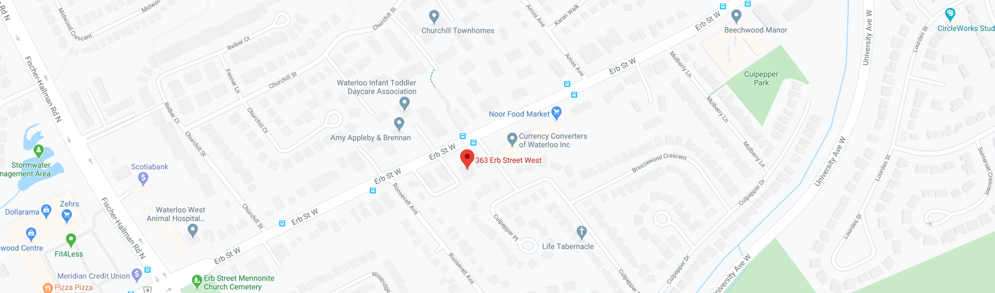 Located on Erb Street, Waterloo, 363 Erb Street West is conveniently located within a walking distance of many grocery stores, restaurants, and shops located on Erb Street, as well as being steps away from GRT bus stops.